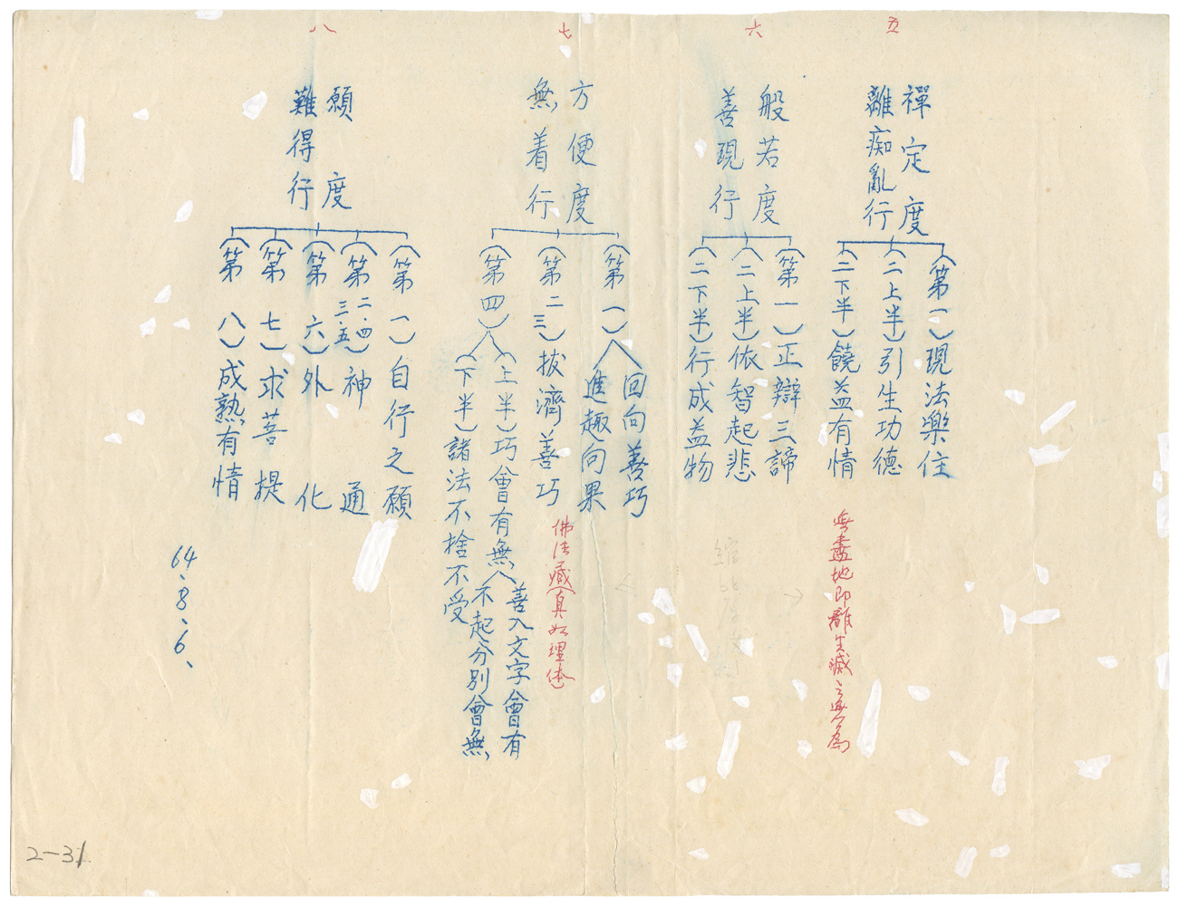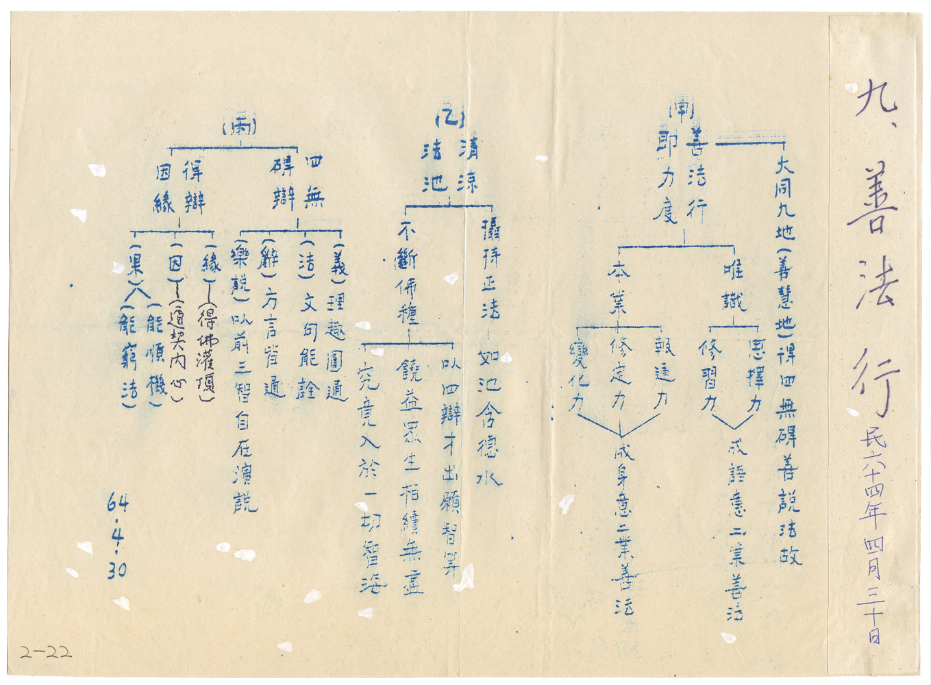 | 描述-目次 | 行體相、初歡喜行(諸佛本所修行)、三無違逆行(辨相、口加侮毀、正顯忍相、四障、諦察法忍、明修忍意)、四無屈撓行(第一、辨精進所為)、五離癡亂行(能持、善解、沮壞六根之聲、正念不亂十相、無亂、無癡、成就正念、華嚴三觀)、六善現行(般若三種、心性百名略舉、說善巧慧)、七無著行(方便、無著、順觀、凡夫愚癡、聞諸法空心大驚怖、要心拔濟)、八難得行(修成善根、方便伏惑略說、雙結二行動寂無礙、雙非二行拂迹入玄)、九善法行(善法行即力度、清涼法池、四無礙辯、無熱惱池、菩薩四河、四河繞池) 、十真實行(徵名、釋相)、十行品重頌分 |