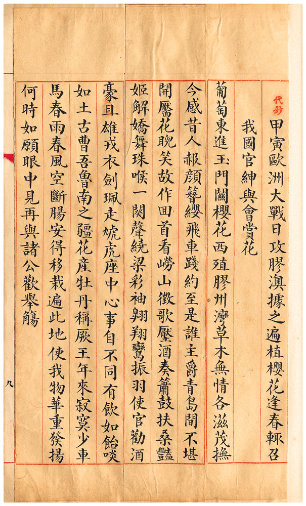 | 件名 | 甲寅歐洲大戰日攻膠澳據之遍植櫻花逢春輒召我國官紳與會賞花 |
