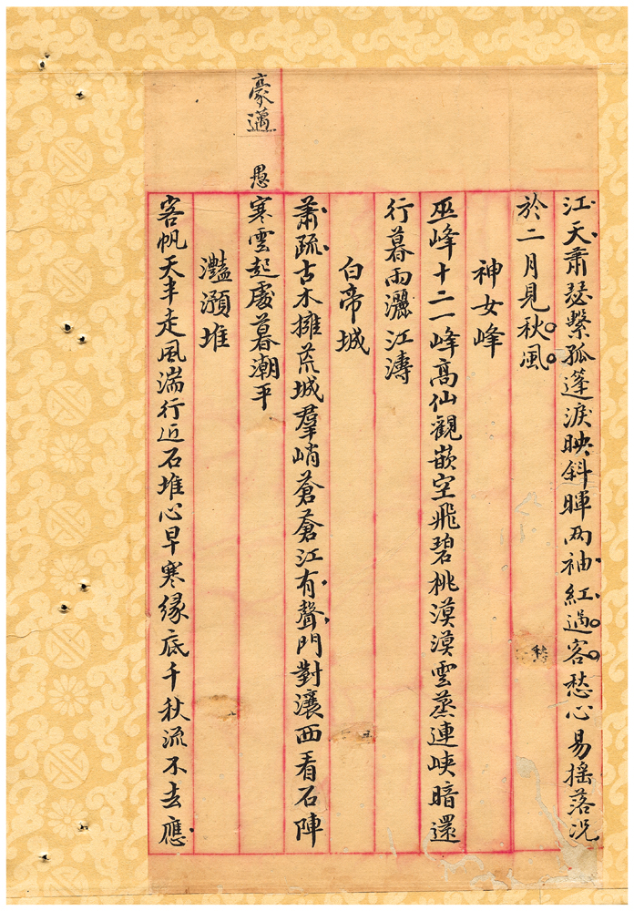 | 描述-摘要 | 蕭疏古木擁荒城。羣峭蒼蒼江有聲。門對瀼西看石陣。寒雲起處暮潮平。 |