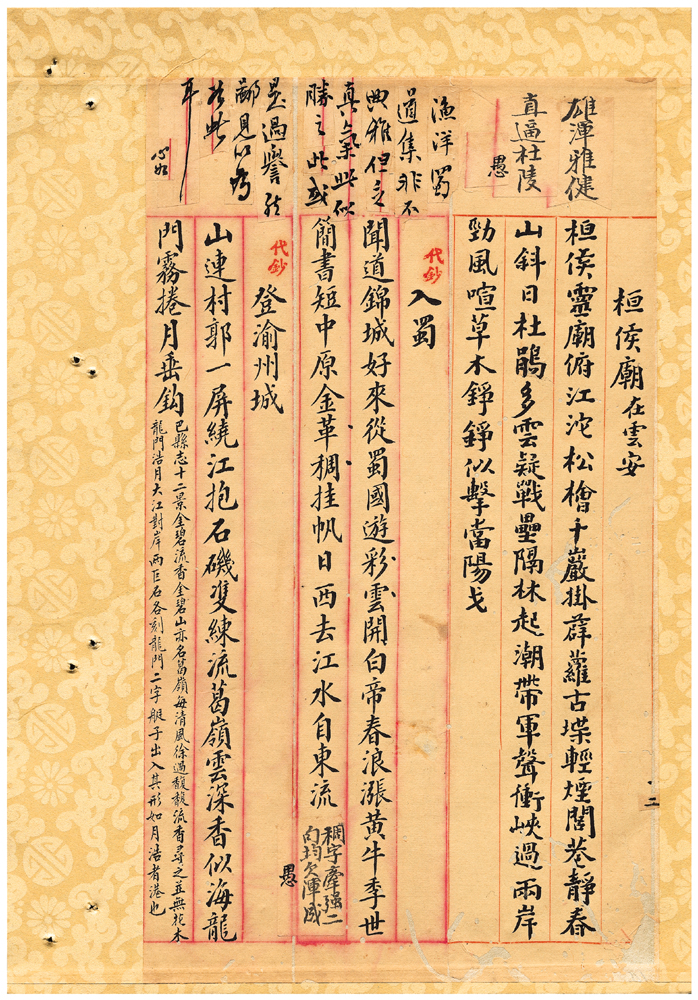 | 描述-摘要 | 聞道錦城好。來從蜀國遊。彩雲開白帝。春浪漲黃牛。季世簡書短。中原金革稠。挂帆日西去。江水自東流。 |