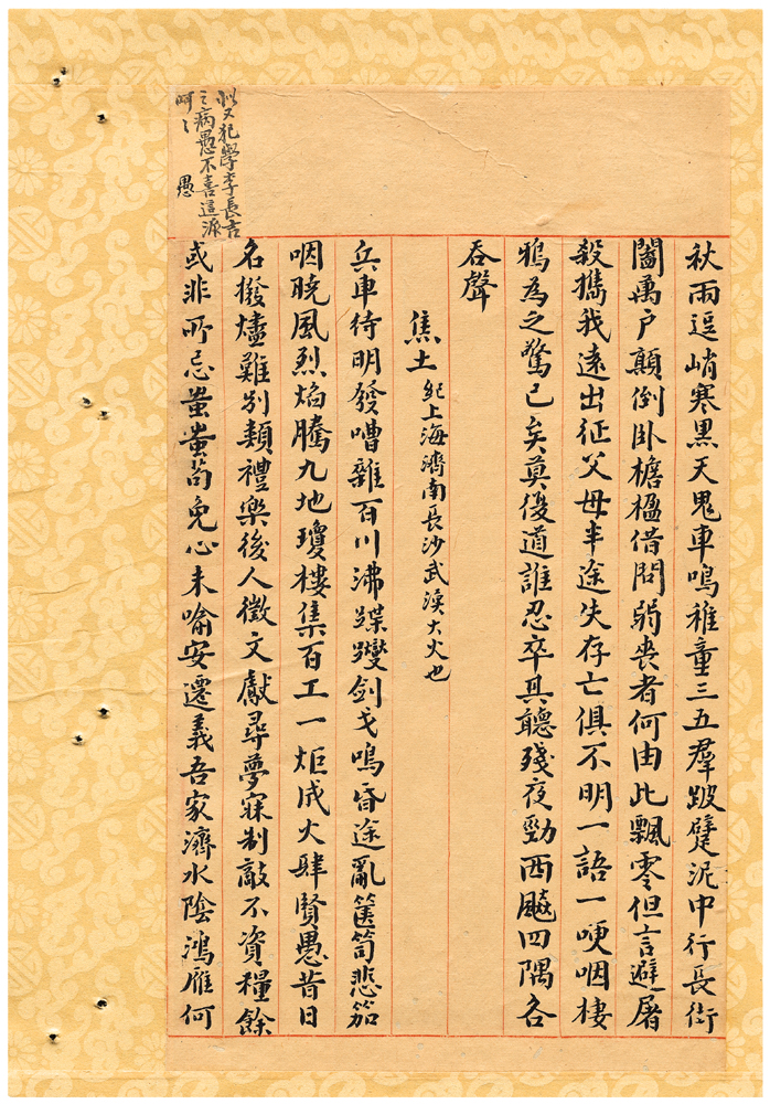 | 描述-摘要 | 兵車待明發。嘈雜百川沸。蹀躞劍戈鳴。昏途亂篋笥。悲笳咽曉風。烈焰騰九地。瓊樓集百工。一炬成火肆。賢愚昔日名。撥燼難別類。禮樂後人徵。文獻尋夢寐。制敵不資糧。餘或非所忌。蚩蚩茍免心。未喻安遷義。吾家濟水陰。鴻雁何由致。國難正殷憂。骨肉應捐棄。 |