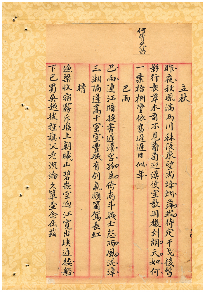 | 描述-摘要 | 昨夜秋風滿兩川。秣陵東望尚烽烟。萍蹤待定干戈後。髩影行衰草木前。不見葡萄迎漢使。空教羽檄到胡天。如何一葉梧桐墜。依舊遲遲日似年。 |
