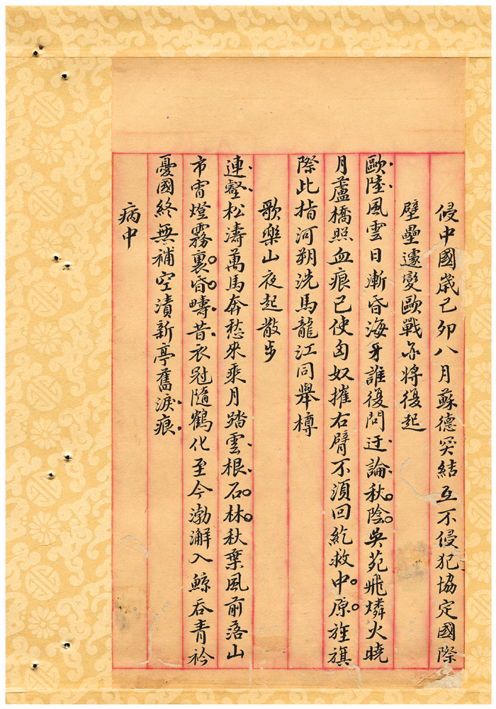 | 描述-摘要 | 病裏難支久客身。挑燈臥聽鼓笳頻。丹傳不老知全妄。書寄平安信未真。榆塞秋風千壁壘。石城寒雨半荊榛。鄉思國恨愁無極。一夜鏡中華髮新。 |