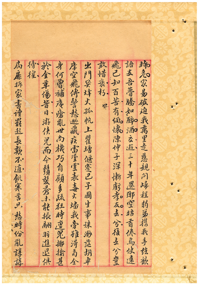 | 描述-摘要 | 時危家易破。迫我萬里走。慈親問歸程。弱弟攜我手。強歡語支吾。瞢騰如醉酒。交遊三十年。還鄉空皓首。倦鳥使遠飛。已知百苦有。緬懷陳仲子。深慚虧孝友。去兮復去兮。豈敢惜衰朽。 |