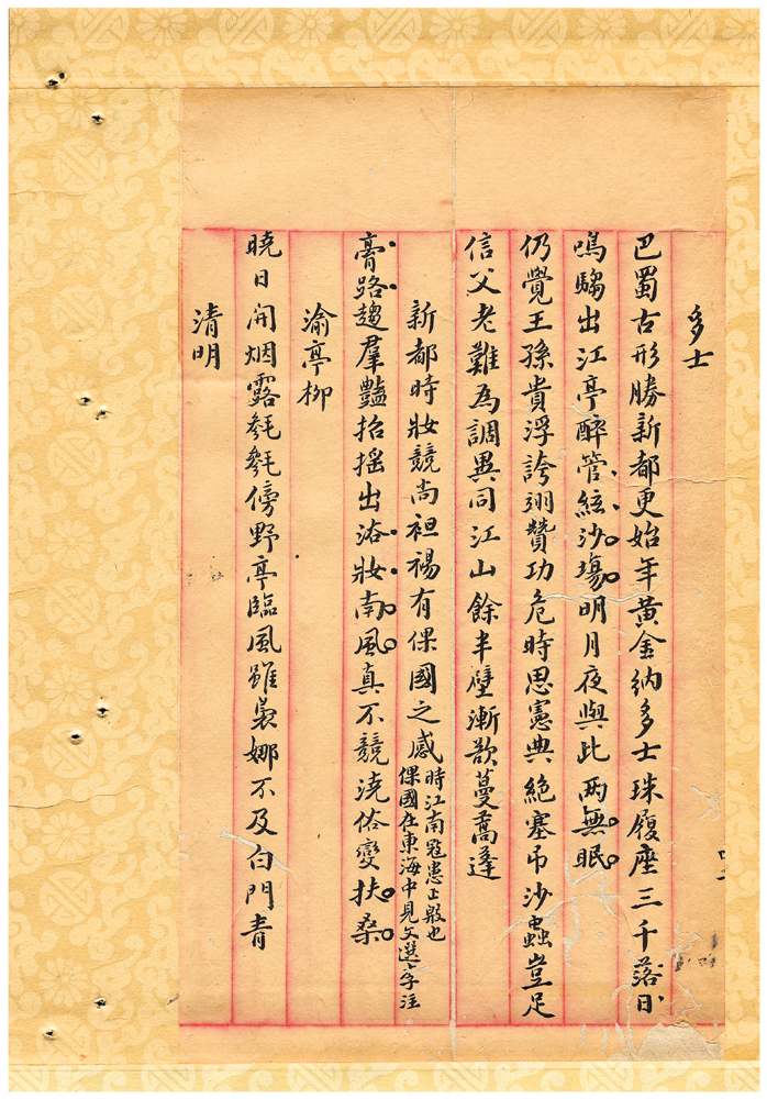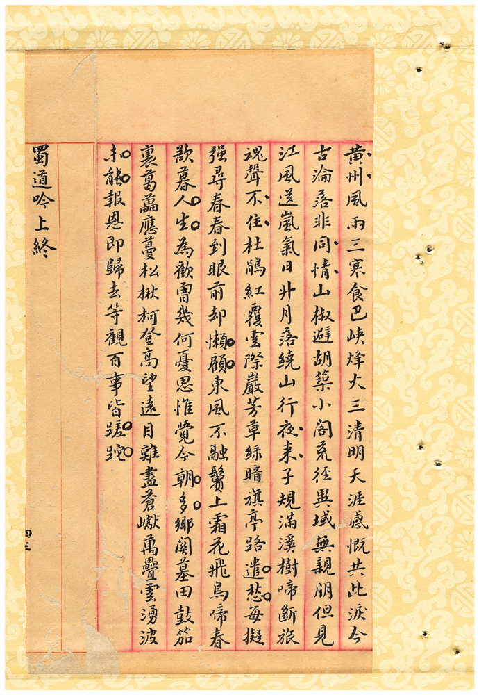 | 描述-摘要 | 黃州風雨三寒食。巴峽烽火三清明。天涯感慨共此淚。今古淪落非同情。山椒避胡築小閣。荒徑異域無親朋。但見江風送嵐氣。日升月落繞山行。夜來子規滿溪樹。啼斷旅魂聲不住。杜鵑紅覆雲際巖。芳草綠暗旗亭路。遣愁每擬強尋春。春到眼前卻懶顧。東風不融鬢上霜。花飛鳥啼春欲暮。人生為歡曾幾何。憂思惟覺今朝多。鄉關墓田鼓笳裏。葛藟應蔓松楸柯。登高望遠目難盡。蒼巘萬疊雲湧波。未能報恩即歸去。等觀百事皆蹉跎。 |