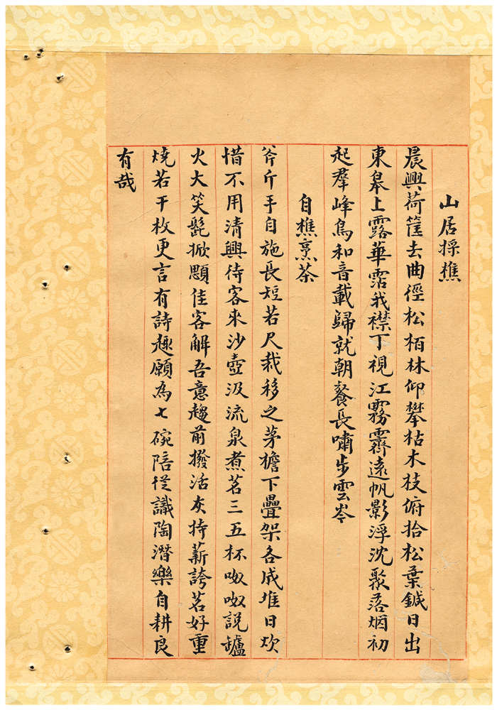 | 描述-摘要 | 斧斤手自施。長短若尺裁。移之茅檐下。疊架各成堆。日炊惜不用。清興待客來。沙壺汲流泉。煮茗三五杯。呶呶說罏火。大笑髭掀顋。佳客解吾意。趨前撥活灰。持薪誇茗好。重燒若干枚。更言有詩趣。願為七碗陪。從識陶潛樂。自耕良有哉。 |