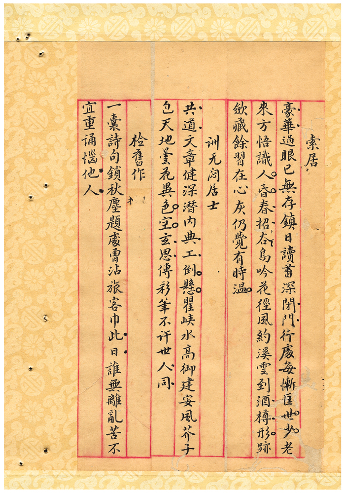 | 描述-摘要 | 共道文章健。深潛內典工。倒懸瞿峽水。高御建安風。芥子包天地。曇花異色空。玄思傳彩筆。不許世人同。 |