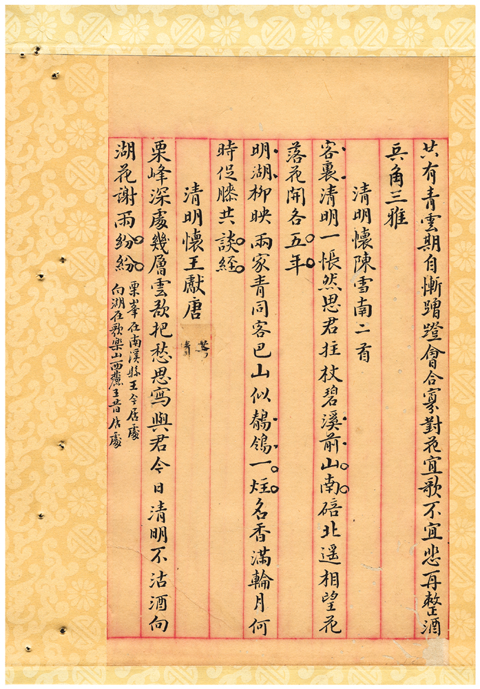 | 描述-摘要 | 栗峰深處幾層雲。欲把愁思寫與君。今日清明不沽酒。向湖花謝雨紛紛。 |
