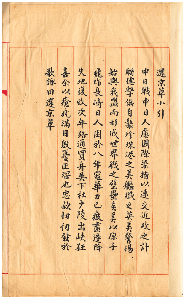 | 描述-摘要 | 還京草小引一篇。李炳南撰 〈還京草小引〉︰中日戰中,日人慮國際染指,以遠交近攻之計,聯德擊俄,自襲珍珠港之美艦,殲之。英美警惕,始與我盟,而形成世界戰之壁壘矣!美以原子飛炸長崎,日人困於八年寇華,力已疲盡,遂降。失地復收,次年路通,買舟吳下。杜少陵出峽狂喜,余以瘡疣滿目,殷憂正深也。忠款忉忉,發於歌詠,曰還京草。 |