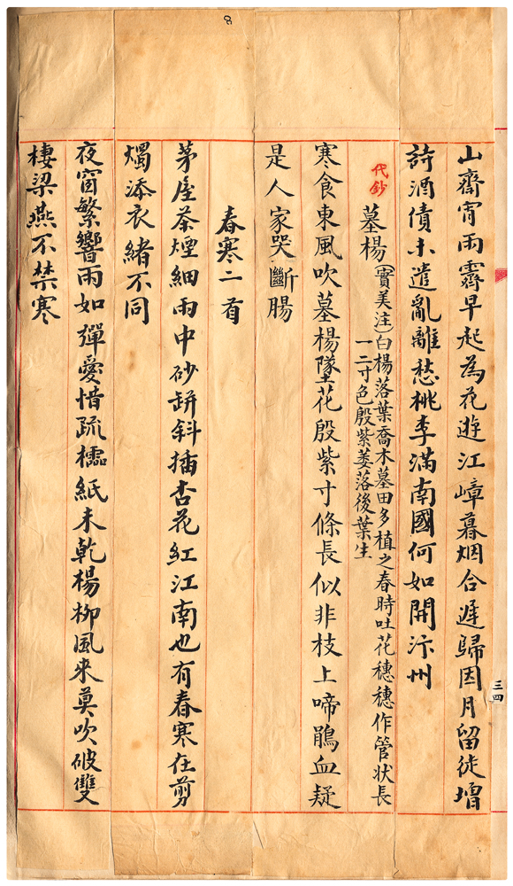 | 描述-摘要 | 寒食東風吹墓楊。墜花殷紫寸條長。似非枝上啼鵑血。疑是人家哭斷腸。 |