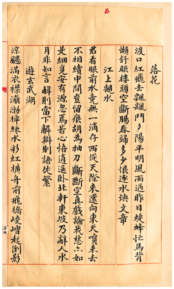 | 描述-摘要 | 渡口紅飛去。飄颻鬥夕陽。平明風雨過。昨日蜨蜂忙。馬背懶舒眼。樓頭空斷腸。春歸多少恨。逐水煥文章。 |