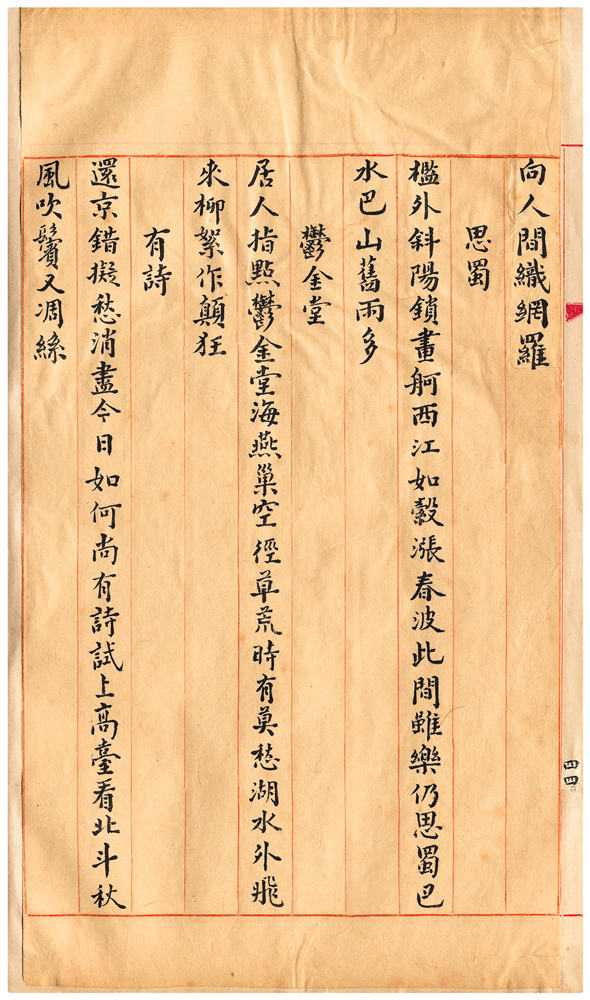 | 描述-摘要 | 瓜果庭前風露多。七襄今夕已停梭。盒中惟有蜘蛛巧。暗向人間織網羅。 |