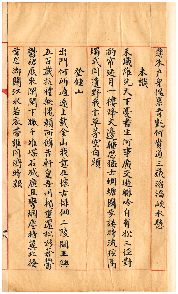 | 描述-摘要 | 未識誰先天下憂。書生何事廣交遊。聯吟自有松三徑。對酌常延月一樓。烽火邊疆思猛士。蜩螗國步誤時流。弦高燭武同遺野。我亦草茅空白頭。 |