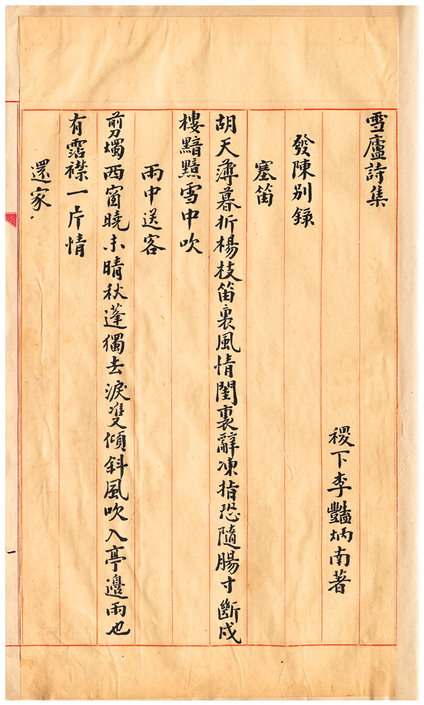| 描述-摘要 | 胡天薄暮折楊枝。笛裏風情閨裏辭。凍指恐隨腸寸斷。戍樓黯黯雪中吹。 |