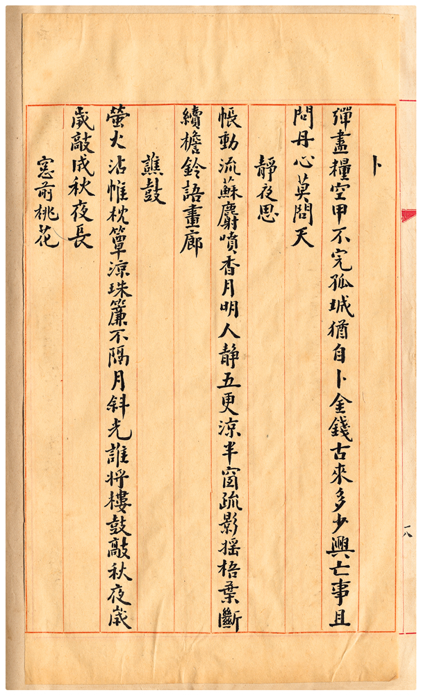 | 描述-摘要 | 螢火沾帷枕簟涼。珠簾不隔月斜光。誰將樓鼓敲秋夜。歲歲敲成秋夜長。 |
