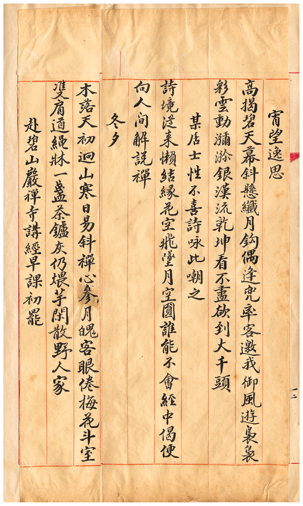 | 描述-摘要 | 木落天初迥。山寒日易斜。禪心參月魄。客眼倦梅花。斗室雙肩道。繩牀一盞茶。鑪灰仍煨芋。閑散野人家。 |