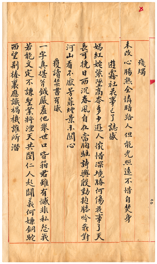| 描述-摘要 | 嫣紅奼紫墜高岑。多少遊人惋惜深。境勝何傷花事了。天長可挽日西沉。春風自在當胸駐。詩興殷勤抱膝吟。我對河山看不厭。芳菲煙景未關心。 |