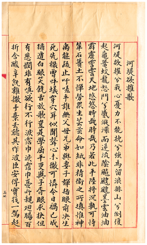 | 描述-摘要 | 河堤欲摧兮我心憂。力不能挽兮強為留。浪排山兮倒復起。黿鼉蛟龍怒鬥兮蹙漩澴而逆流。陰飈颼颼。墨雲油油。霹靂霅霅。天地悠悠。時哉時哉乃若此。平陸將沉孰可恃。輦石簣土不憚勞。眾生芸芸命如紙。非精衛之所填。惟神禹能疏止。吁嗟乎。誰無父母兄弟與妻子。彈指眼前決生死。先機曾呼蟻穿穴。耳似聞聲心未徹。可憐今日禍已成。猶遭白眼笑饒舌。放歌豈是學屈平。更異子胥眼求抉。但有悲憫非有嗔。欲行不行淚霑巾。淚霑巾。憂所親。迴腸百折含酸辛。既難撒手棄去聽其作波臣。安得寶筏一駕超之離苦津。如之何。同沉淪。如之何。同沉淪。 |