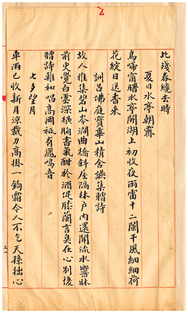 | 描述-摘要 | 鳥啼窗曙水亭開。湖上初收夜雨雷。十二闌干風細細。荷花綻日送香來。 |