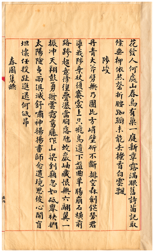 | 描述-摘要 | 花發人何處。山春鳥有巢。一庭新草露。滿眼舊詩苗。記取絛垂柳。依然磬折腰。踟躕未能去。搔首白雲飄。 |