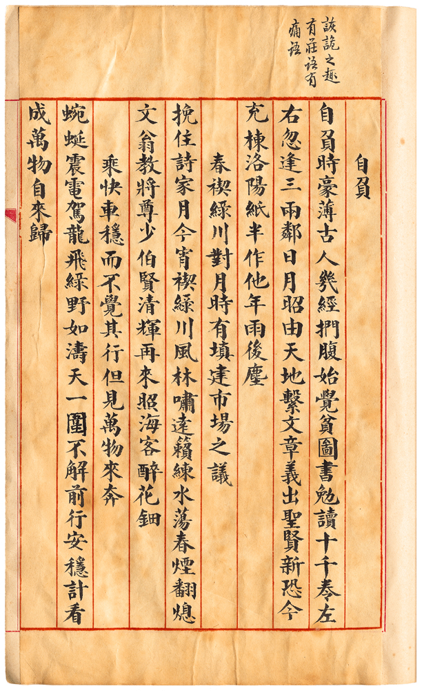 | 描述-摘要 | 自負時豪薄古人。幾經捫腹始覺貧。圖書勉讀十千卷。左右忽逢三兩鄰。日月昭由天地繫。文章義出聖賢新。恐今充棟洛陽紙。半作他年雨後塵。 |