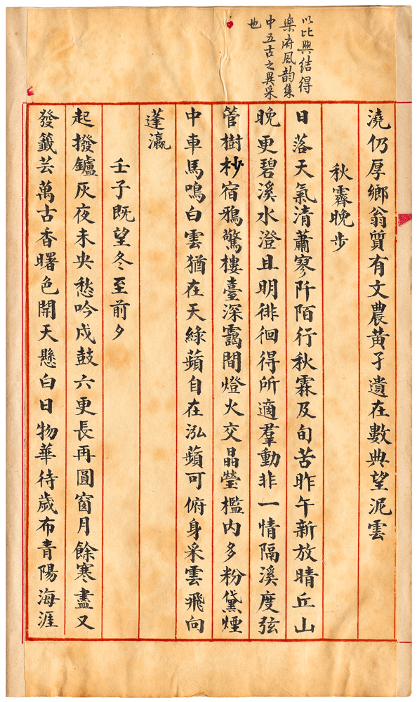 | 描述-摘要 | 日落天氣清。蕭寥阡陌行。秋霖及旬苦。昨午新放晴。丘山晚更碧。溪水澄且明。徘徊得所適。羣動非一情。隔溪度弦管。樹杪宿鴉驚。樓臺深靄間。燈火交晶瑩。檻內多粉黛。煙中車馬鳴。白雲猶在天。綠蘋自在泓。蘋可俯身采。雲飛向蓬瀛。 |