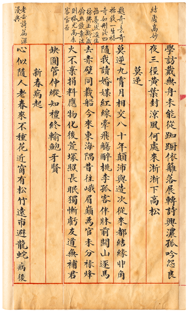 | 描述-摘要 | 莫逆九霄月。相交八十年。顛沛與造次。從來都結緣。丱角隨我讀。婚媒紅線牽。飛觴醉桃李。孤客伴床前。關山逐馬去。赤壁同載船。今來東海隅。昔往峨眉巔。為官未分祿。烽火不棄捐。料應物化後。荒塚照長眠。獨慚虧友道。無補君缺圓。管仲縱知禮。終輸鮑牙賢。 |