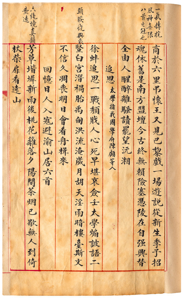 | 描述-摘要 | 徐蚌追思一戰頺。戕人心死早堪哀。僉壬太學煽詖語。二豎白宮潛禍胎。禹甸洪流淹歲月。胡天淫雨暗樓臺。斯文不信久凋喪。明日會看舟楫來。 |