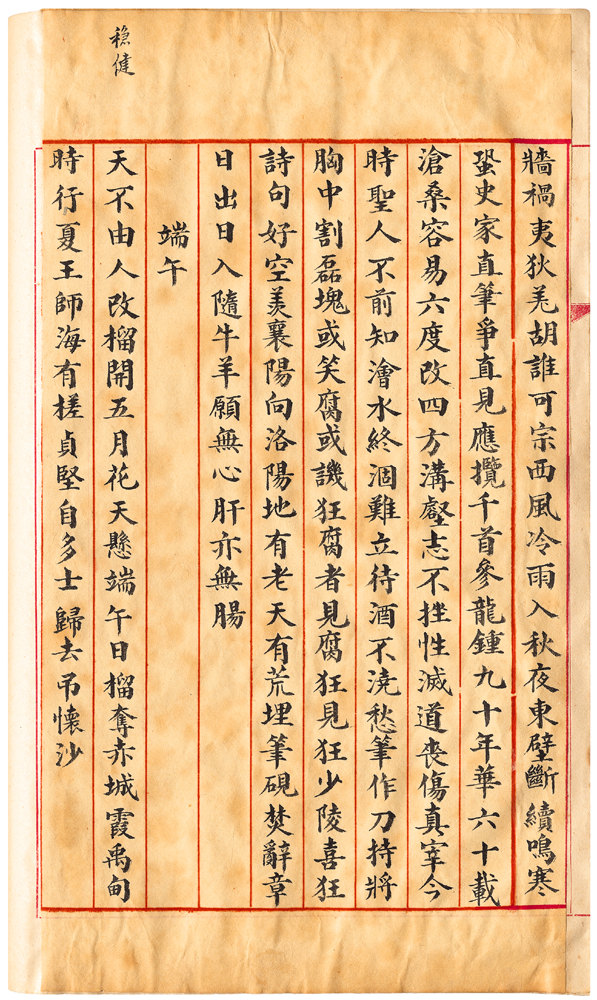 | 描述-摘要 | 天不由人改。榴開五月花。天懸端午日。榴奪赤城霞。禹甸時行夏。王師海有槎。貞堅自多士。歸去弔懷沙。 |
