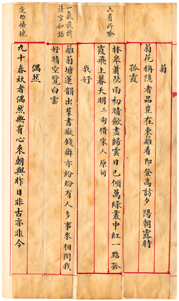 | 描述-摘要 | 籬菊塘蓮韻出群。書癡錢癖亦紛紛。有人多事來相問。我好晴空覽白雲。 |