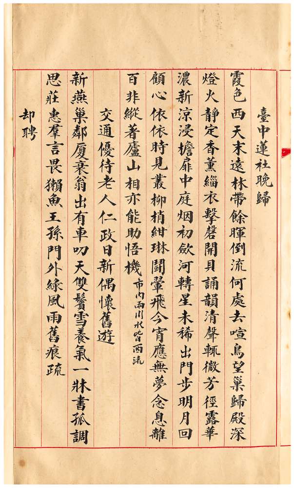| 描述-摘要 | 霞色西天末。遠林帶餘暉。倒流何處去。喧鳥望巢歸。殿深燈火靜。定香薰緇衣。擊磬開貝誦。韻清聲輒微。芳徑露華濃。新凉浸檐扉。中庭烟初歛。河轉星未稀。出門步明月。回顧心依依。時見叢柳梢。紺琳鬪翬飛。今宵應無夢。念息離百非。縱著廬山相。亦能助悟機。 |