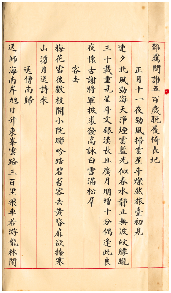 | 描述-摘要 | 梅花雪後數枝開。小院聯吟踏碧苔。客去黃昏扉欲掩。寒山湧月送詩來。 |