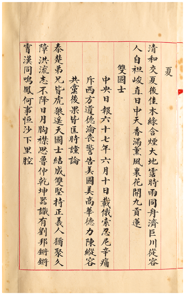 | 描述-摘要 | 清和交夏後。佳木綠含煙。大地霑時雨。同舟濟巨川。從容人自袒。峻直日中天。香滿薰風裏。花開九貢蓮。 |