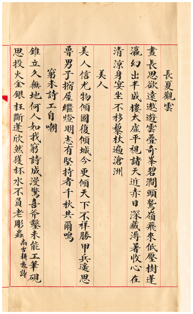 | 描述-摘要 | 晝長思欲遠遨遊。雲疊奇峰碧澗頭。鷲嶺飛來低壓樹。蓬瀛幻出半成樓。太虛平視諸天近。赤日深藏溽暑收。心在清涼身宴坐。不移藜杖遍滄洲。 |