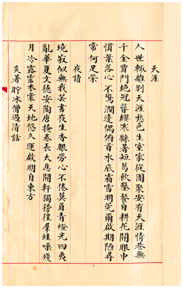 | 描述-摘要 | 境寂似無我。芸書夜生香。眼勞心不倦。莫負青燈光。四夷亂華夏。文德安陶唐。掩卷長太息。開軒獨徬徨。群蛙噪殘月。冷露霑衣裳。天地悠久運。啟明自東方。 |