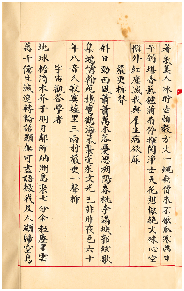 | 描述-摘要 | 地球檐滴水。芥子明月鄰。所納洲島聚。七分金粒塵。星雲萬千億。生滅速轉輪。語顯無可盡。語微我及人。顯歸空鳥跡。微則難與陳。垂名留皮業。曠野傾水銀。迷時有明暗。覺後無冬春。覺心當前認。言說都非真。 |