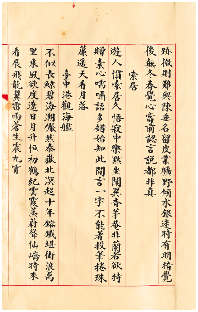 | 描述-摘要 | 遊人慣索居。久悟寂中樂。黙坐聞異香。茅庵非蘭若。欲持贈素心。嚅囁語多錯。始知此間言。一字不能著。投筆捲珠簾。遙天看月落。 |