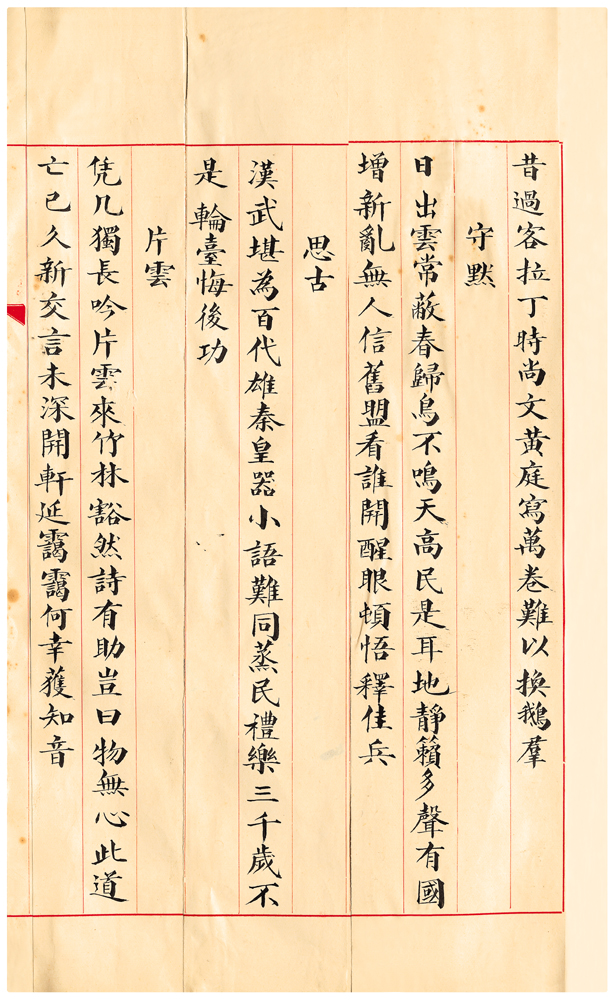 | 描述-摘要 | 凭几獨長吟。片雲來竹林。豁然詩有助。豈曰物無心。此道亡已久。新交言未深。開軒延靄靄。何幸獲知音。 |