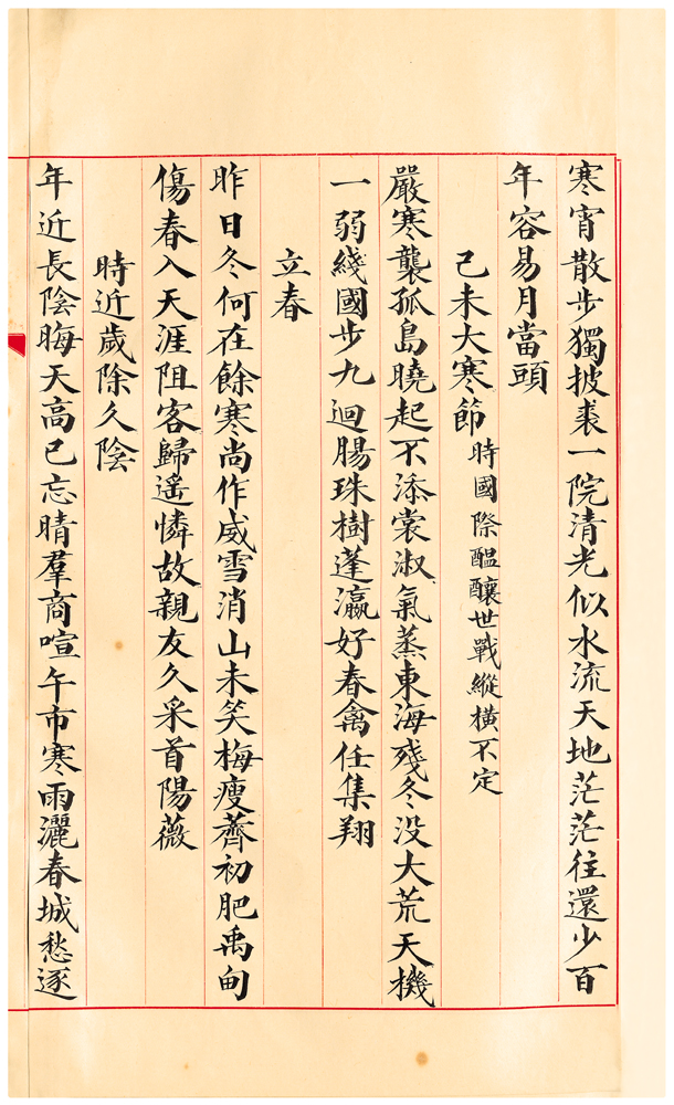 | 描述-摘要 | 寒宵散步獨披裘。一院清光似水流。天地茫茫往還少。百年容易月當頭。 |