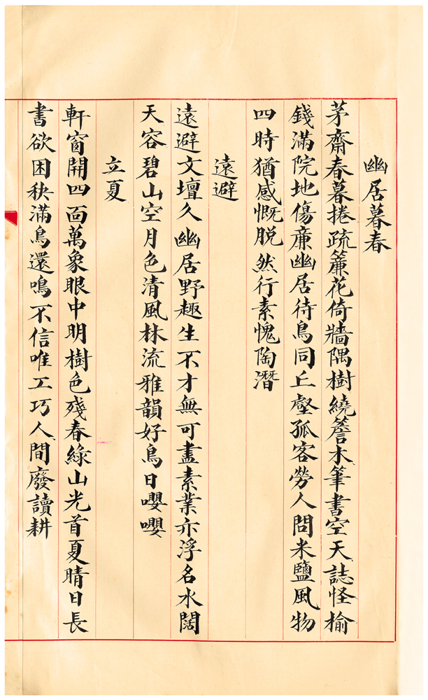 | 描述-摘要 | 茅齋春暮捲疏簾。花倚牆隅樹繞簷。木筆書空天誌怪。榆錢滿院地傷廉。幽居待鳥同[丘- |]壑。孤客勞人問米鹽。風物四時猶感慨。脫然行素愧陶潛。 |