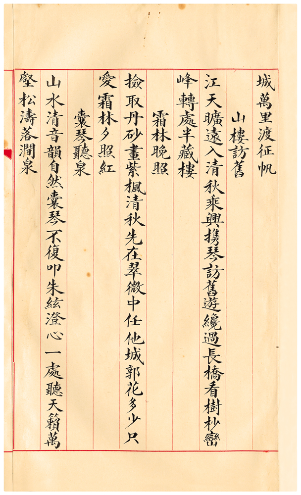 | 描述-摘要 | 撿取丹砂畫紫楓。清秋先在翠微中。任他城郭花多少。只愛霜林夕照紅。 |