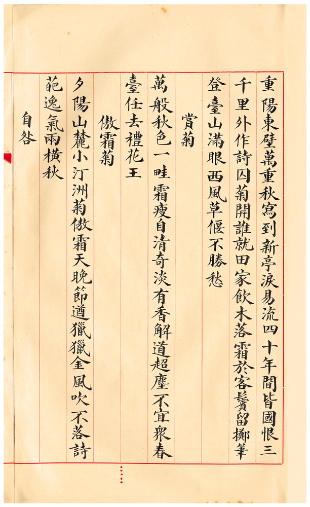 | 描述-摘要 | 重陽東壁萬重秋。寫到新亭淚易流。四十年間皆國恨。三千里外作詩囚。菊開誰就田家飲。木落霜於客鬢留。擲筆登臺山滿眼。西風草偃不勝愁。 |