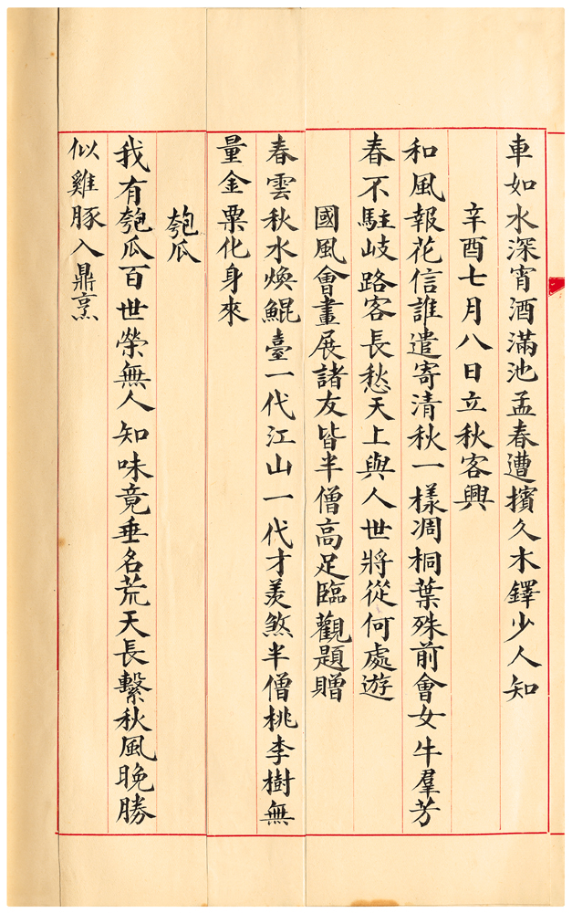 | 描述-摘要 | 我有匏瓜百世榮。無人知味竟垂名。荒天長繫秋風晚。勝似雞豚入鼎烹。 |