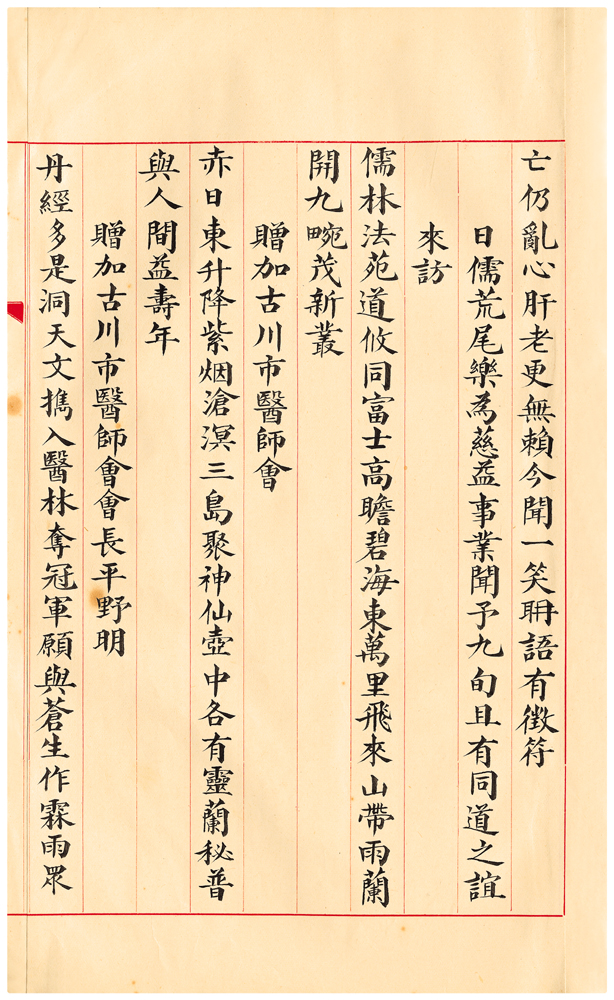| 描述-摘要 | 儒林法苑道攸同。富士高瞻碧海東。萬里飛來山帶雨。蘭開九畹茂新叢。 |