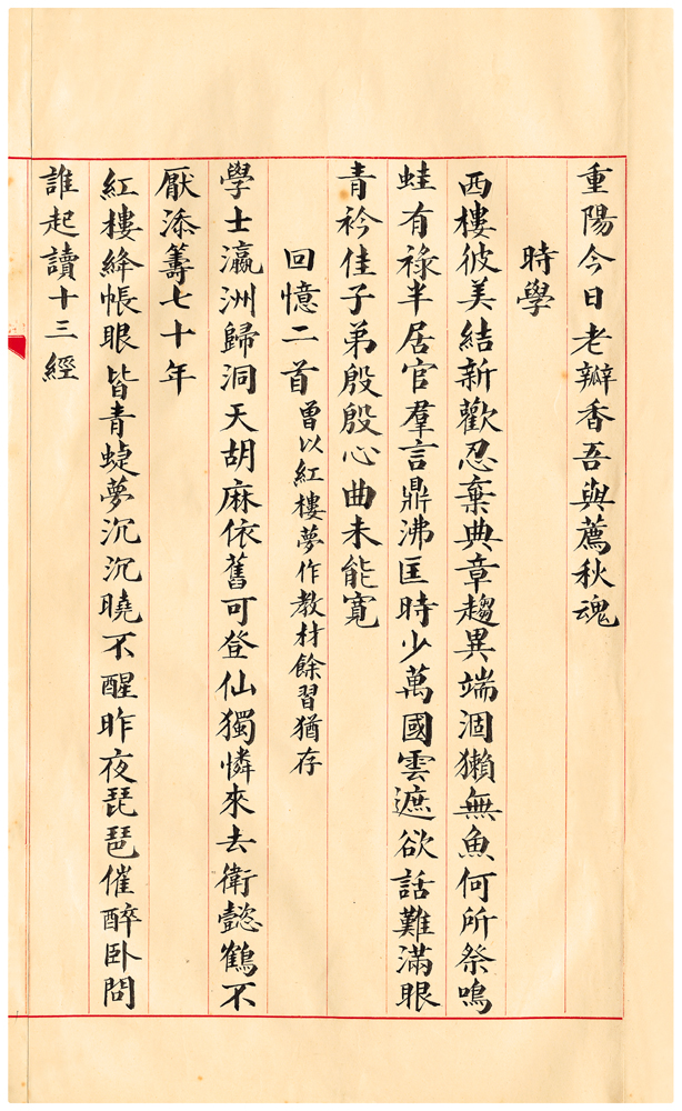 | 描述-摘要 | 東籬蕭瑟菊猶存。戶外南山夕照昏。興盡何妨詩一句。庭空不必酒盈樽。霜高楓落晚霞紫。地靜蘆閑晴雪屯。聞道重陽今日老。瓣香吾與薦秋魂。 |