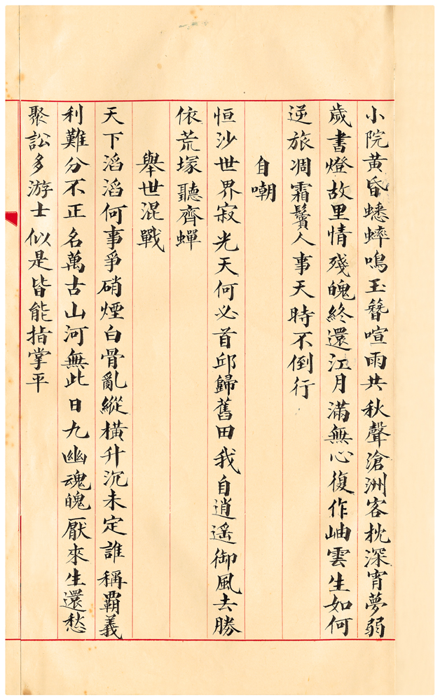 | 描述-摘要 | 小院黃昏蟋蟀鳴。玉簪喧雨共秋聲。滄洲客枕深宵夢。弱歲書燈故里情。殘魄終還江月滿。無心復作岫雲生。如何逆旅凋霜鬢。人事天時不倒行。 |