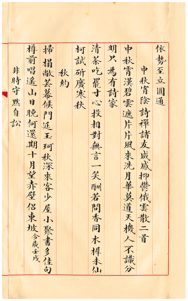 | 描述-摘要 | 掃榻敞芸幕。候門延玉珂。秋深來客少。屋小聚書多。佳句樽前唱。遙山日晚何。還期十月望。赤壁侶東坡。 |