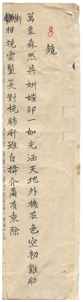 | 描述-摘要 | 萬象森然具。妍媸印一如。光涵天地外。機在色空初。雞肋慚相視。雲鬟笑對梳。肺肝雖自揜。介爾有乘除。 |