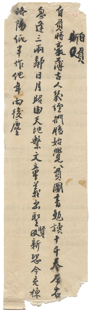 | 描述-摘要 | 自負時豪薄古人。幾經捫腹始覺貧。圖書勉讀十千卷。左右忽逢三兩鄰。日月昭由天地繫。文章義出聖賢新。恐今充棟洛陽紙。半作他年雨後塵。 |