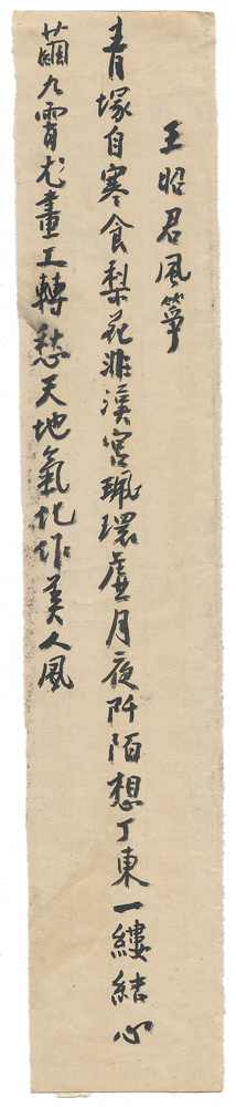 | 描述-摘要 | 青塚自寒食。梨花非漢宮。珮環虛月夜。阡陌想丁東。一縷結心繭。九霄尤畫工。轉愁天地氣。化作美人風。 |